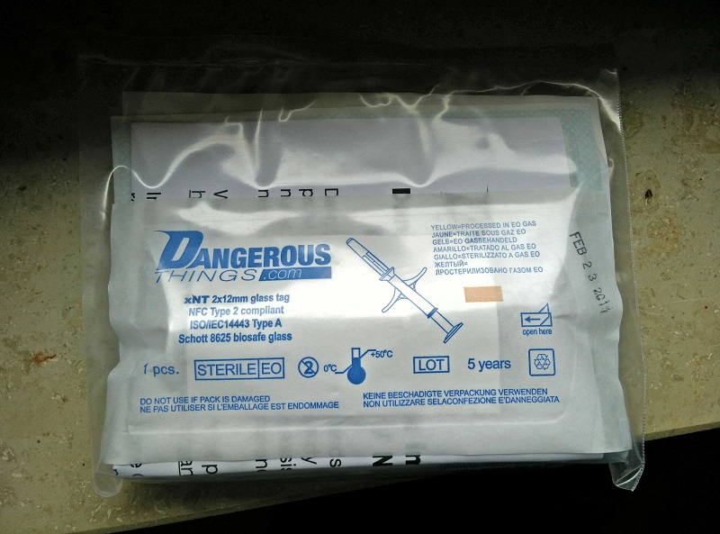 Noch am Abend des besagten Beitrags war ich mit unserem Redakteur Phillipp im Hangout. „Das ist total cool! Das muss man haben!“ hieß es von ihm. Es ging um einen NFC-Tag, welcher unter der Haut angebracht wird. Mit ihm kann man Türen öffnen, Smartphones entsperren oder einfache Dinge, wie Texte, Kontakte oder URLs speichern. Ich hatte den Beitrag nicht gesehen, und habe natürlich sofort zur Aufgabe bekommen, mir das Video online anzuschauen. Sehr interessant, neu und verrückt war das, was ich zu Augen bekam. „Interessant, neu, technisch, und dann auch noch verrückt? – Das ist genau mein Ding!!!“ Die kommenden Tage informierte ich mich ein wenig und hörte mir die Meinungen meiner Mitmenschen an: „Risiko!“, „Nutzen?“, „Voll krass!, „Sinn?“, „Krank!“. Ja, sie vielen eher so -naja- bis -negativ- aus. Aber egal! Ich hatte Bock drauf!! Außerdem wäre es nicht das erste mal, dass ich Leute von neuen, ungewohnten Dingen, wie Google Glass, überzeugen kann. Also bestellte ich mir das Ding. 99$, also knappe 80€ scheinen ein fairer Deal zu sein, außerdem freute ich mich schon darauf das Ganze beim Zoll anzumelden. – Was die wohl wieder für Augen machen!
